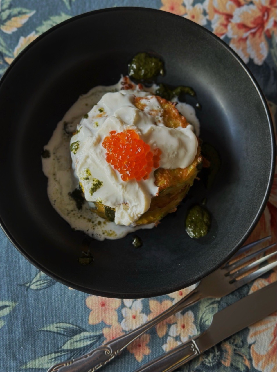 СО СТРАЧАТЕЛЛОЙ, СОУСОМ ПЕСТО И КРАСНОЙ ИКРОЙ
