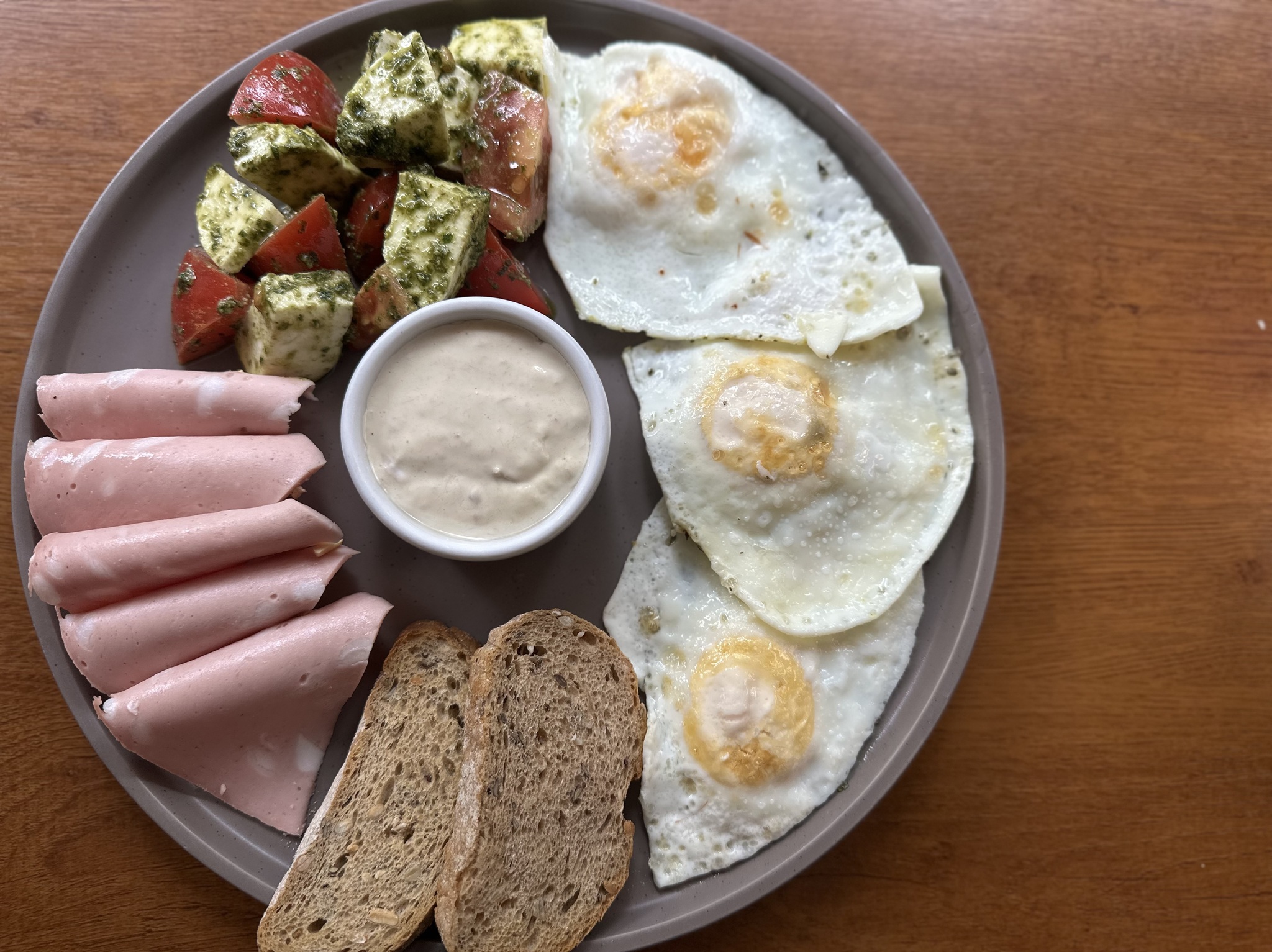 ТРИ ЯЙЦА, МОЦАРЕЛЛА С ПОМИДОРАМИ, МОРТАДЕЛЛА, СОУС ТОННАТО, ГРЕНКИ