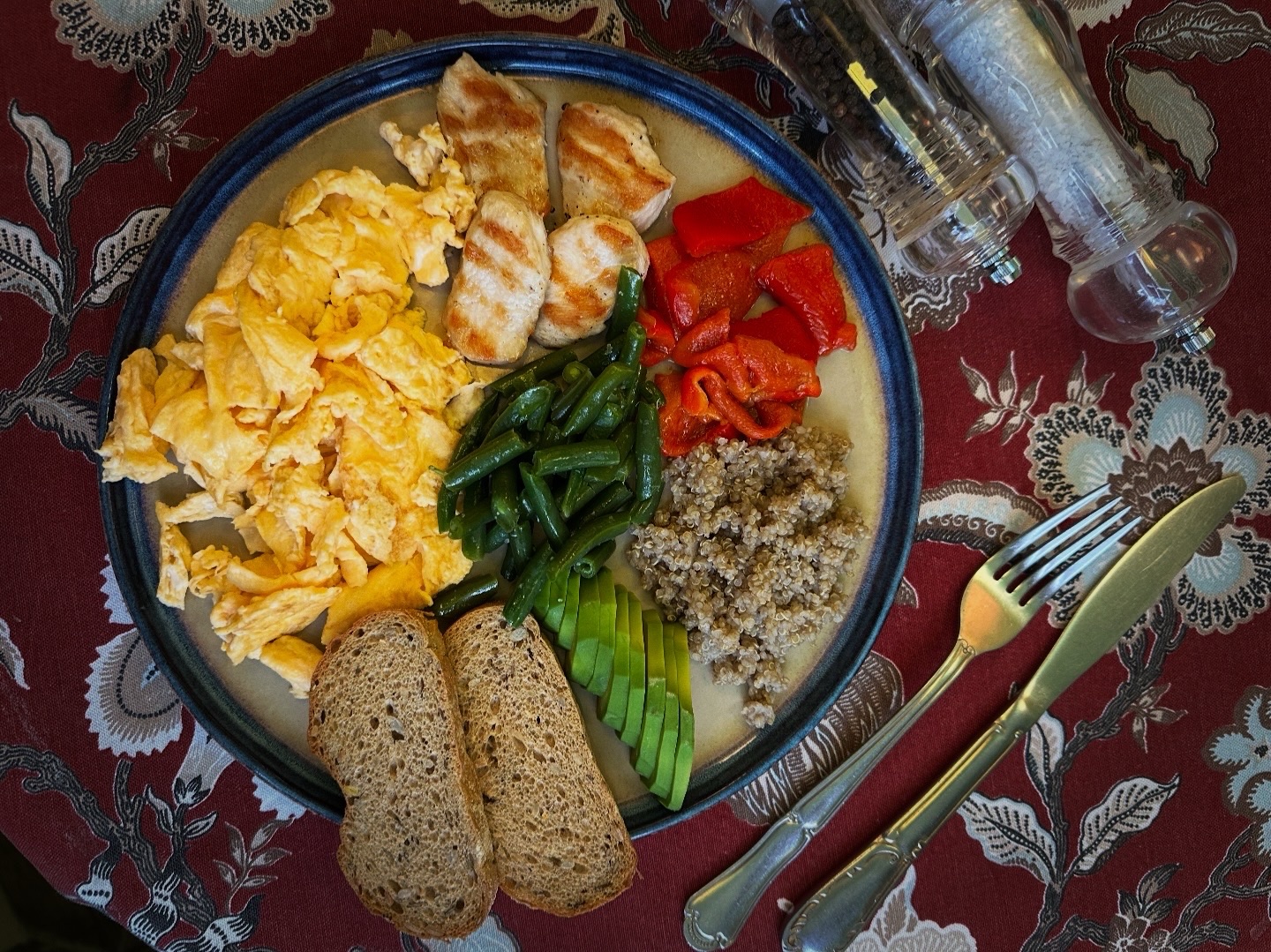 СКРЭМБЛ, КУРИНОЕ ФИЛЕ, КИНОА, ФАСОЛЬ, ПЕЧЕНЫЙ ПЕРЕЦ, АВОКАДО, ГРЕНКИ